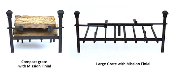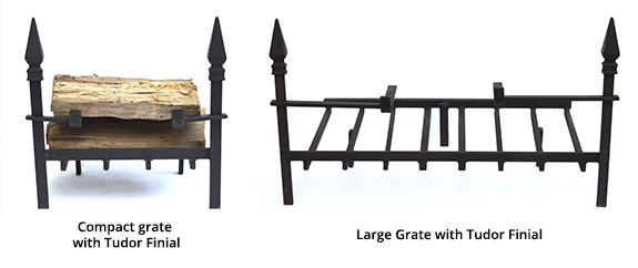 Adding 5 inches to the overall height of your uprights, the Tudor finial is a dramatic addition to your fireplace. When using a 15” tall Standard or Large grate, you must have at least 20.5” from the floor of your fireplace to the smoke guard, or upper opening of your fireplace, for Tudor finials to be fully visible. If you have a 13” tall Compact grate, you’ll need at least a 19” vertical clearance.